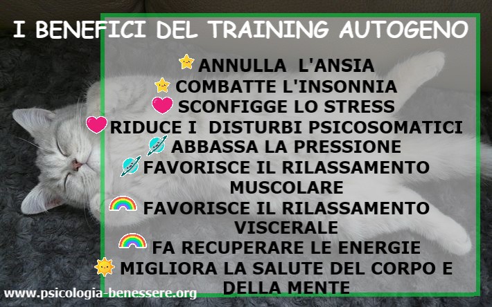 Lo stato di rilassamento che viene a crearsi, in conseguenza di un adeguato allenamento che parte dai muscoli (come nel TA), produce l’effetto di scaricare le tensioni in eccesso, dovute all’ansia e allo stress, e di recuperare il benessere psicofisico.